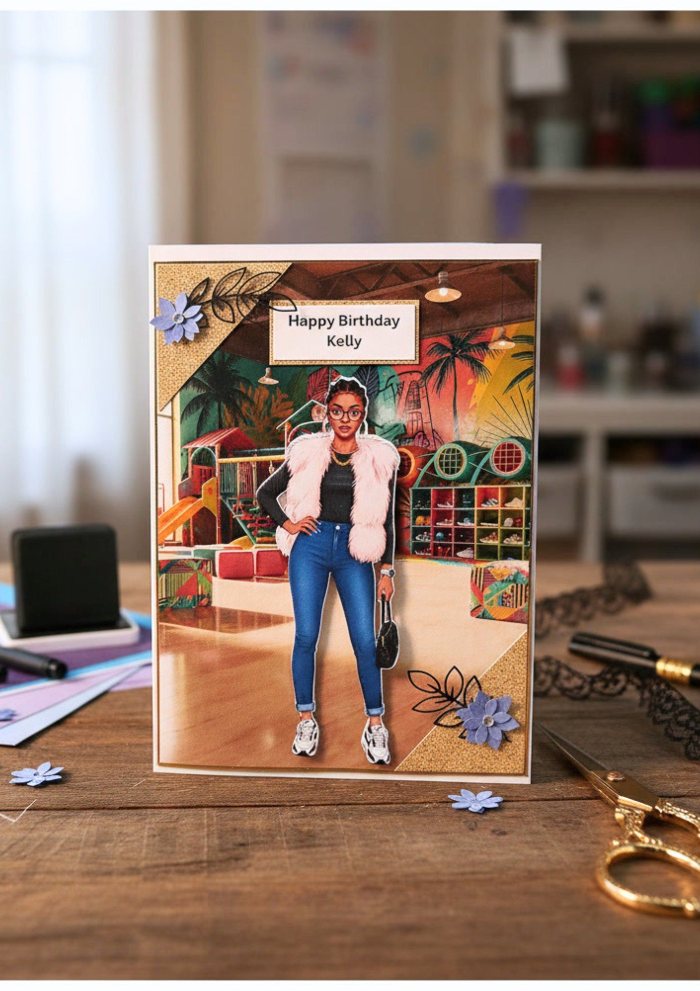 Celebrate Kelly with this bold and playful personalised  3D 400 GSM birthday card, designed to blend fashion, fun, and vibrant colour. The illustration features a stylish woman dressed in a pink fur vest, black top, blue jeans, white sneakers, and glasses, confidently posing with a chic black handbag. She stands in a lively indoor playground setting filled with bright slides, climbing frames, and colourful cubby shelves, creating a joyful and energetic backdrop.