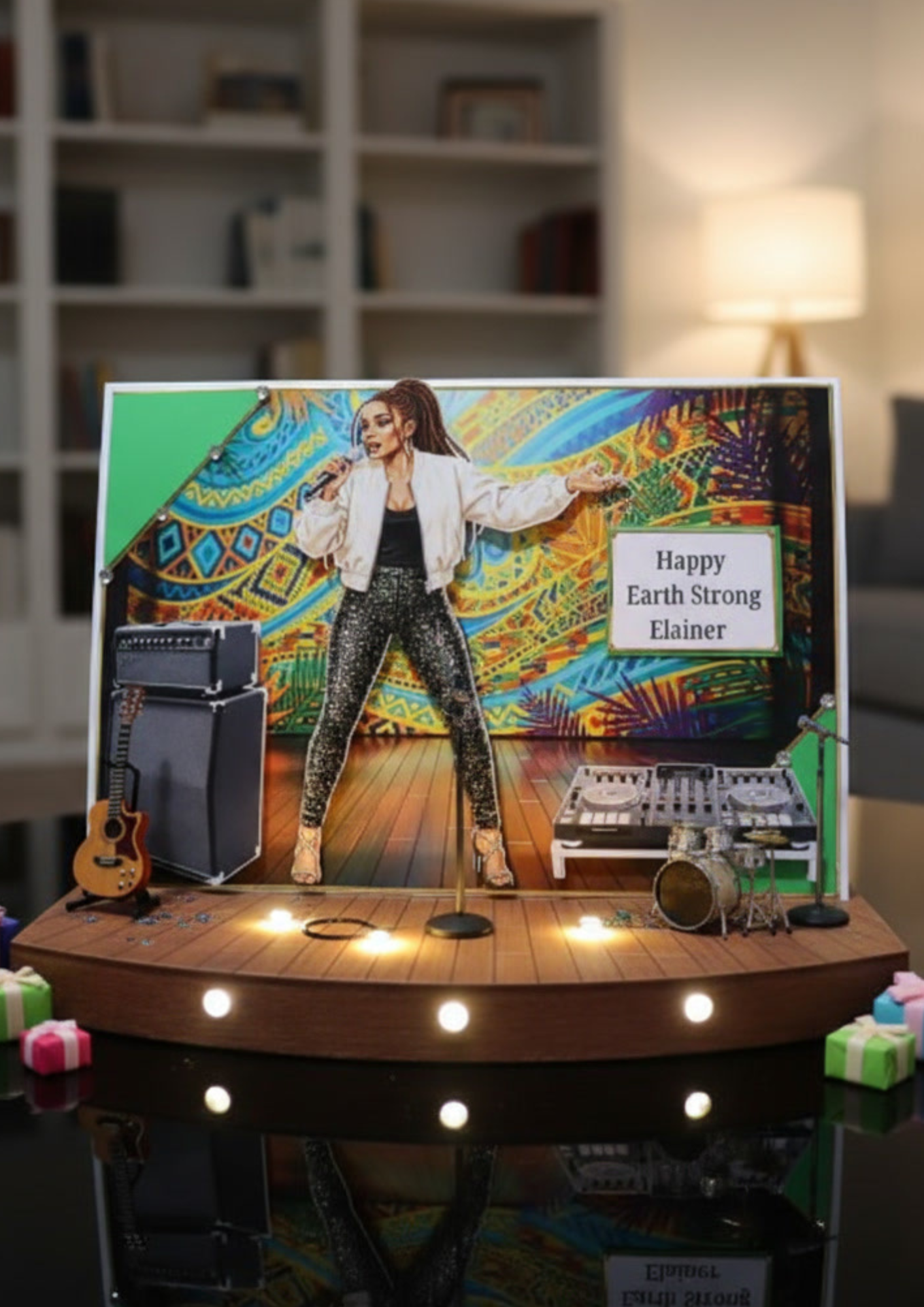 Bespoke 3D Handcrafted birthday card featuring a stylish female singer performing on stage against a vibrant, colorful backdrop. Accented with sparkling gems and detailed stage elements, this unique design reads “Happy Earth Strong Elainer,” making it a perfect keepsake for music lovers and anyone who enjoys bold, artistic birthday cards.
