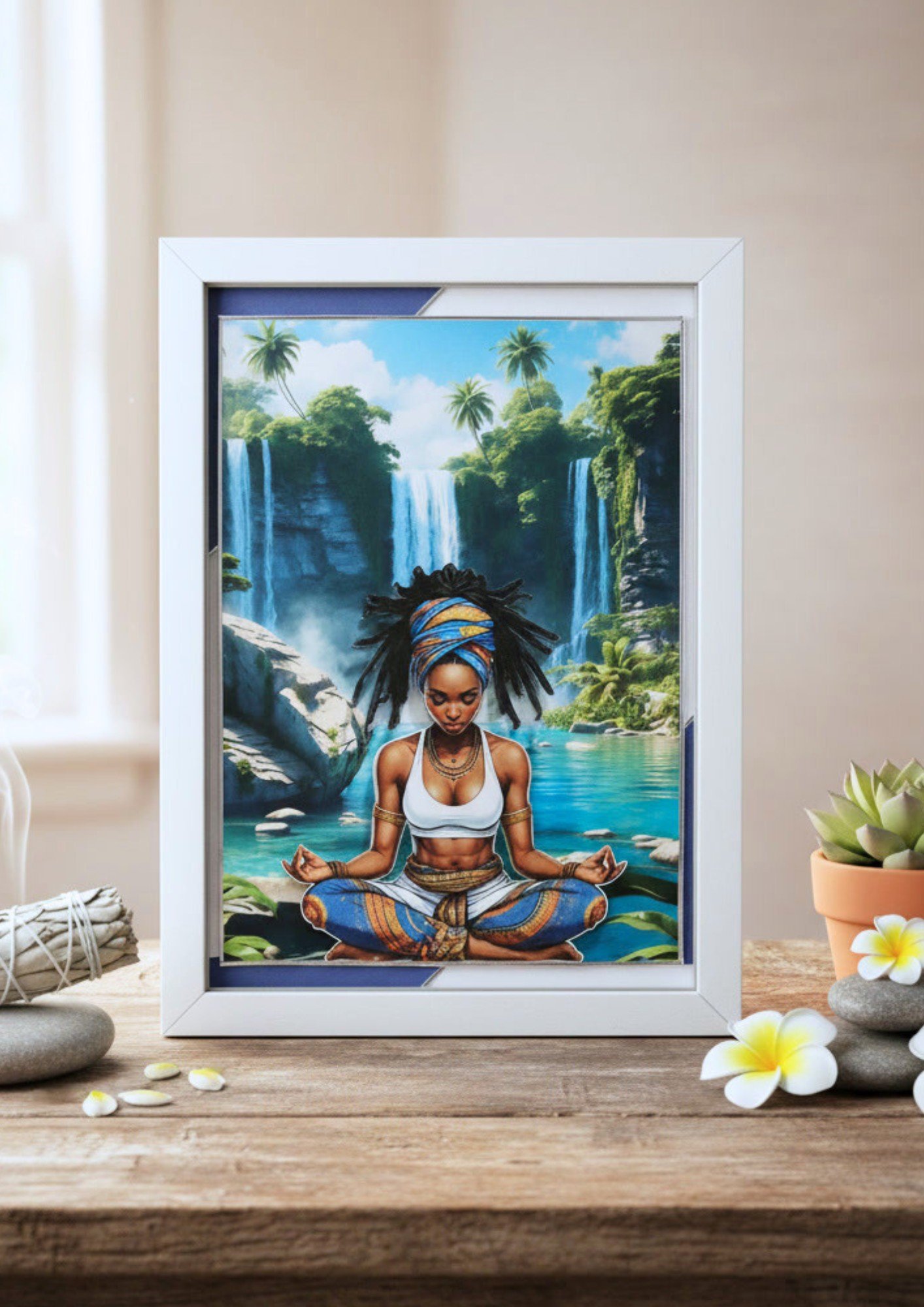Set within a lush natural sanctuary of cascading waterfalls, green trees, smooth rocks, and a tranquil blue river, the artwork radiates harmony and inner stillness. The rich colours and detailed composition create a calming visual experience that celebrates mindfulness and the beauty of nature.