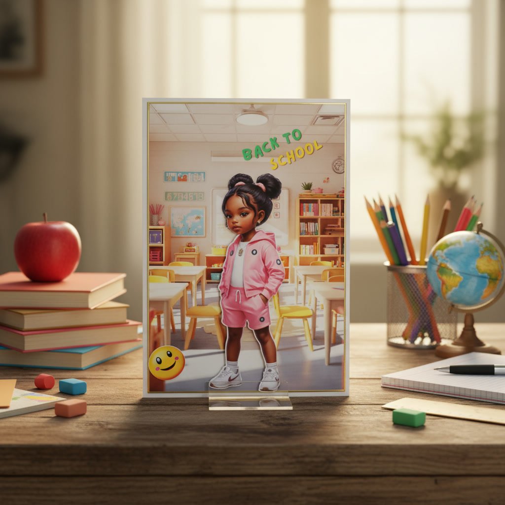 This  3D  400GSM card showcases a warm and inviting classroom scene designed with a playful, back-to-school theme. At the center is a stylized illustration of a young girl standing confidently with her hands in her pockets. She wears a coordinated pink outfit consisting of a hooded jacket and matching shorts, paired with white sneakers. Her hair is styled in two high buns, adding to her cute and expressive look.