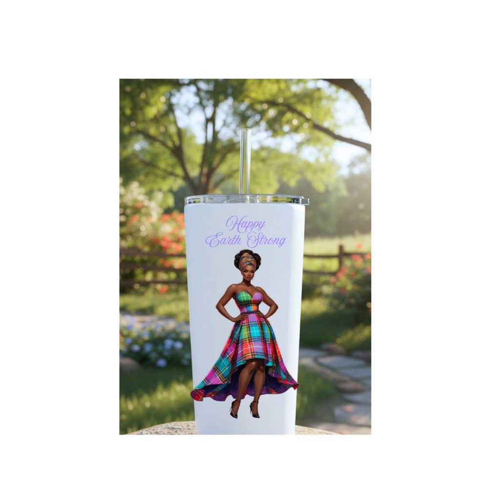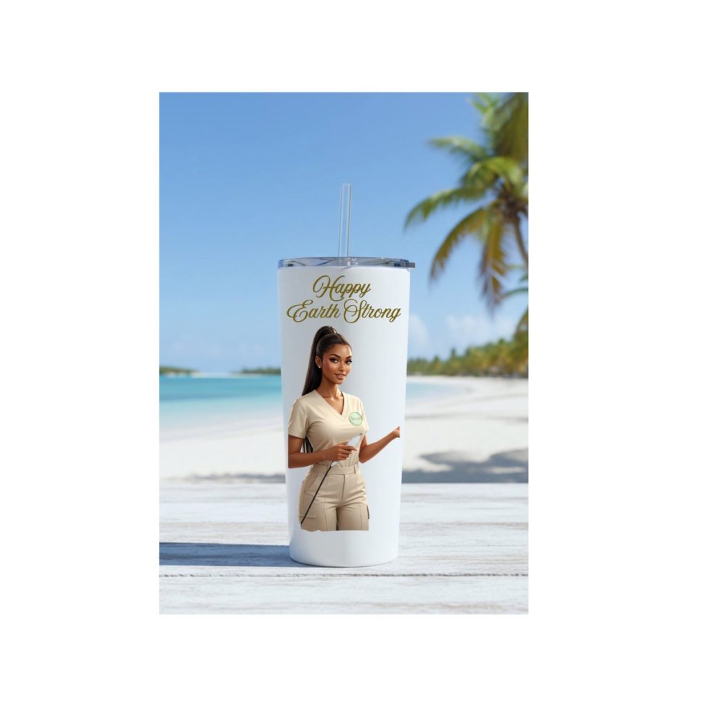 She is wearing in a beige outfit, paired with the message “Happy Earth Strong.” Suitable for hot or cold drinks.